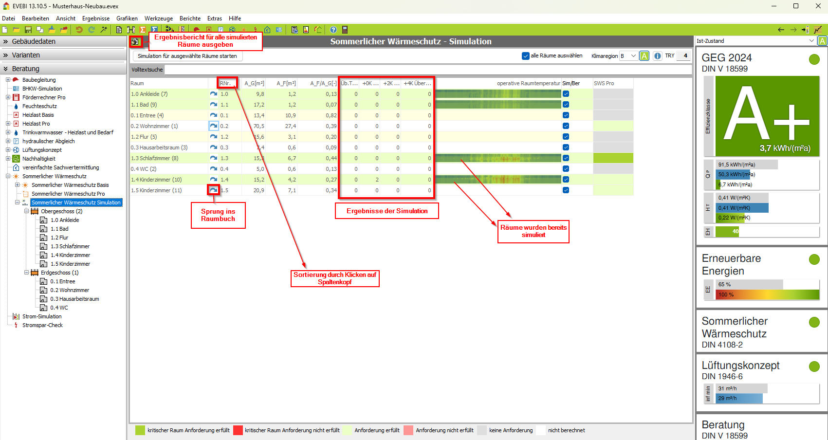 - Wechseln Sie auf die Maske Sommerlicher Wärmeschutz - Simulation In der Übersichtsmaske zum Sommerlichen Wärmeschutz - Simulation werden alle Räume und deren Simulationsergebnisse angezeigt.