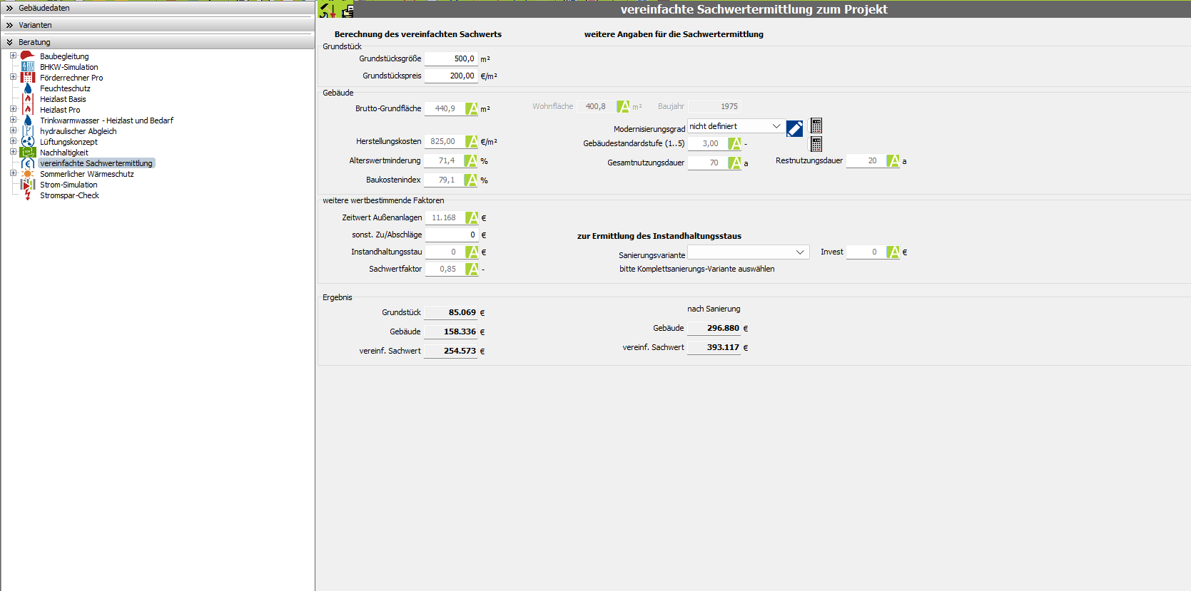 Bedienung der „vereinfachten Sachwertermittlung“