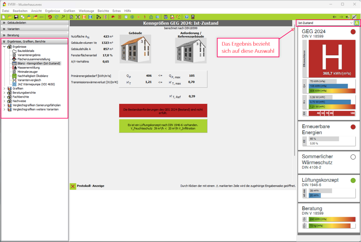 EVEBI bietet eine Vielzahl von Ergebnisausgaben in Textform und als Grafiken bzw. Schaubilder. Auf dem Register Ergebnisse finden Sie dazu im Navigationsbereich die entsprechenden Einträge.