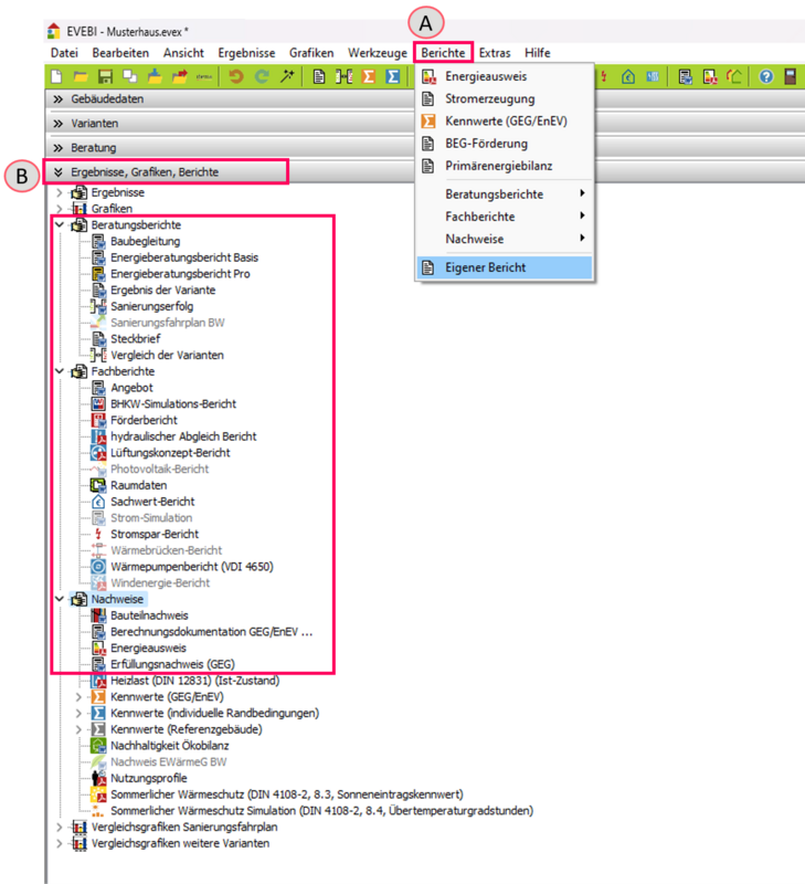 - Die Auswahl der Berichte ist von den Projekteinstellungen abhängig. Während für Bestandsgebäude ein Beratungsbericht ausgegeben werden kann, wird für Neubauten eine Berechnungsdokumentation angeboten.