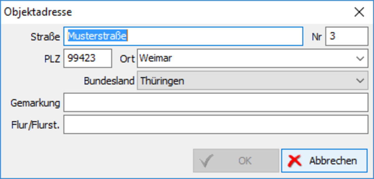 - Geben Sie hier die Adresse des Objektes ein, zu dem der Bericht erstellt werden soll und bestätigen Sie den Dialog mit OK. Auf diese Adresse können Sie beim Bearbeiten der Kundenadresse zugreifen.