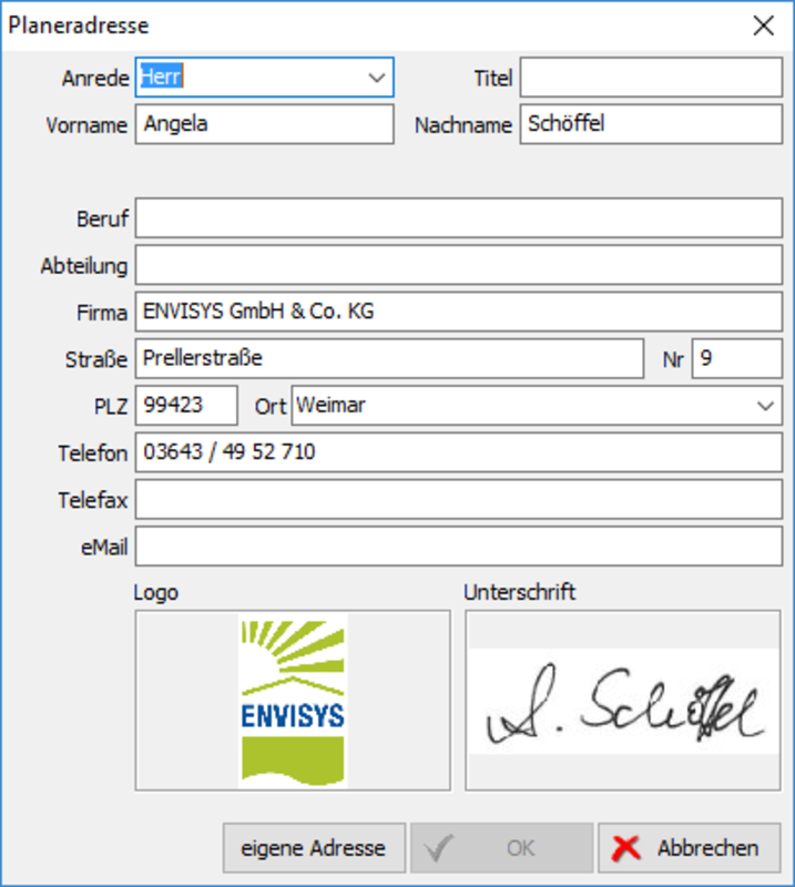 - Geben Sie hier die Adresse des Planers ein. Über die Schaltfläche eigene Adresse können Sie die Daten der eigenen Adresse übernehmen. siehe auch unter: Eigene Adresse bearbeiten