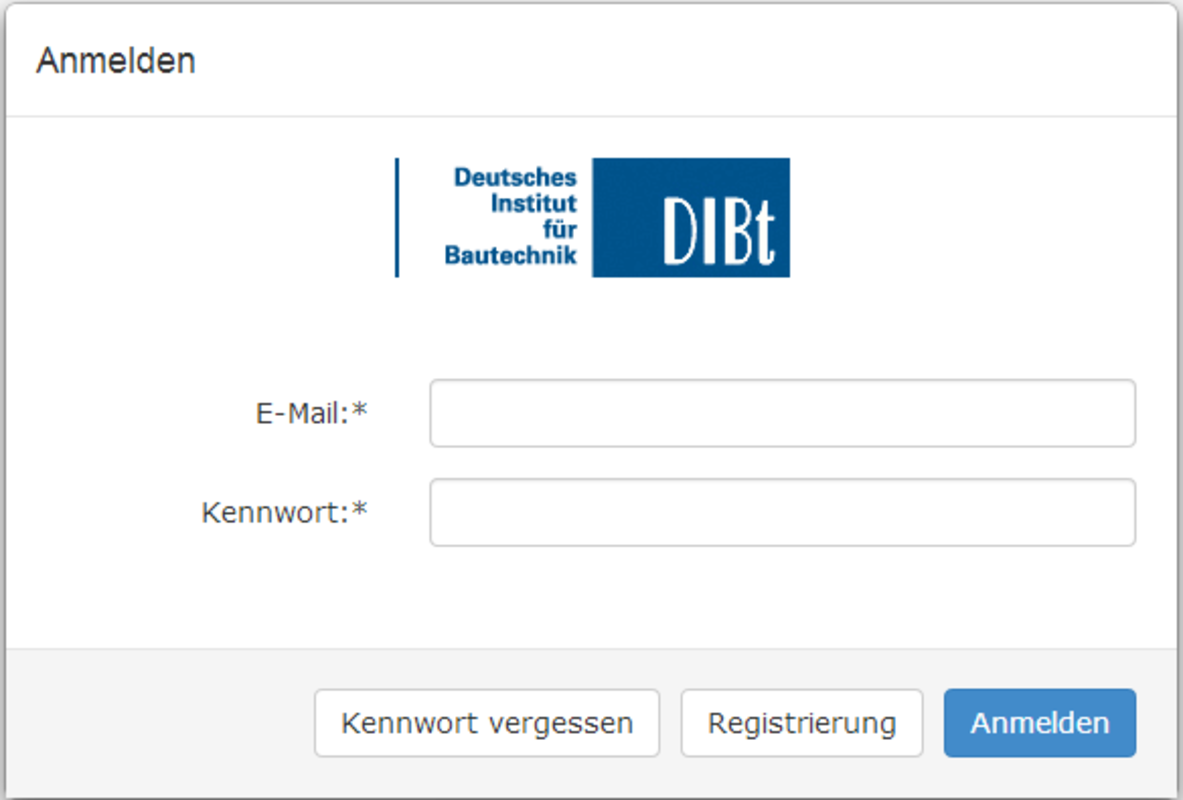 Dialog Anmeldung DIBt - Klicken Sie auf die Schaltfläche Registrierung, um sich erstmalig zu registrieren.