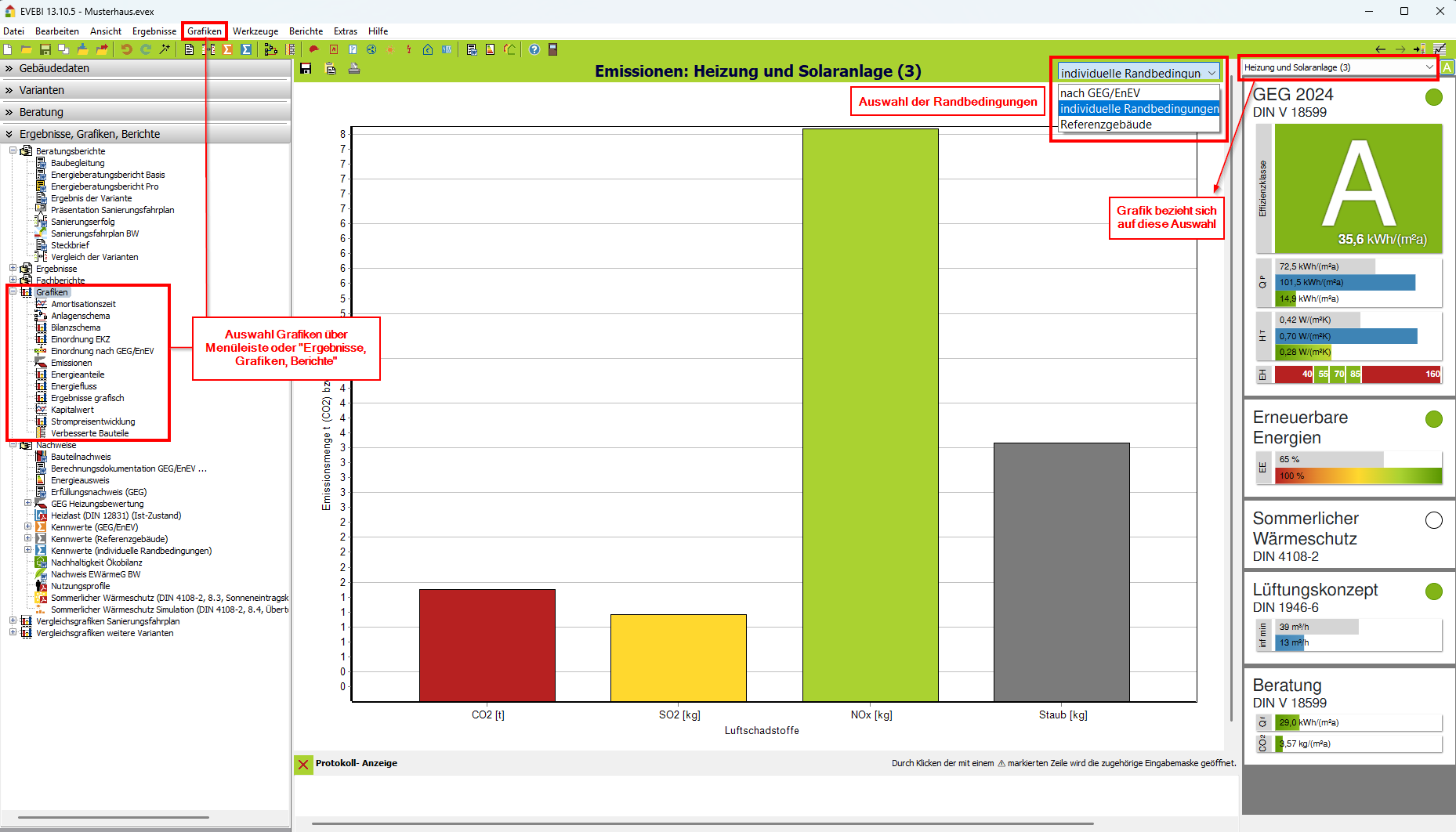 - Sie können bei einigen Grafiken zusätzlich wählen, ob die Ausgabe nach GEG, mit freien Randbedingungen oder für das Referenzgebäude erfolgen soll.