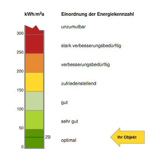 Zur Einordnung des Objektes kann eine Grafik angezeigt werden, die das Gebäude entsprechend seiner Energiekennzahl zwischen “unzumutbar” und “optimal” einordnet. Diese Grafik steht nur im Berechnungsverfahren nach LEG zur Verfügung.