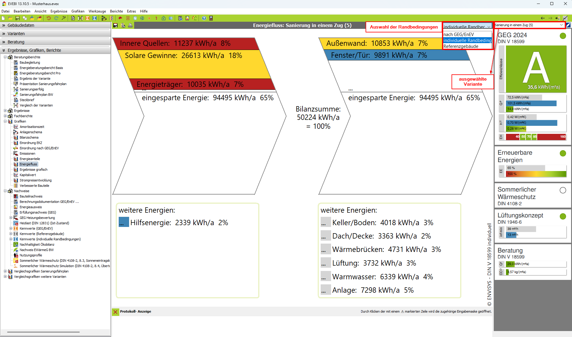 - Sie können bei dieser Grafik zusätzlich wählen, ob die Ausgabe nach GEG, mit freien Randbedingungen oder für das Referenzgebäude erfolgen soll.