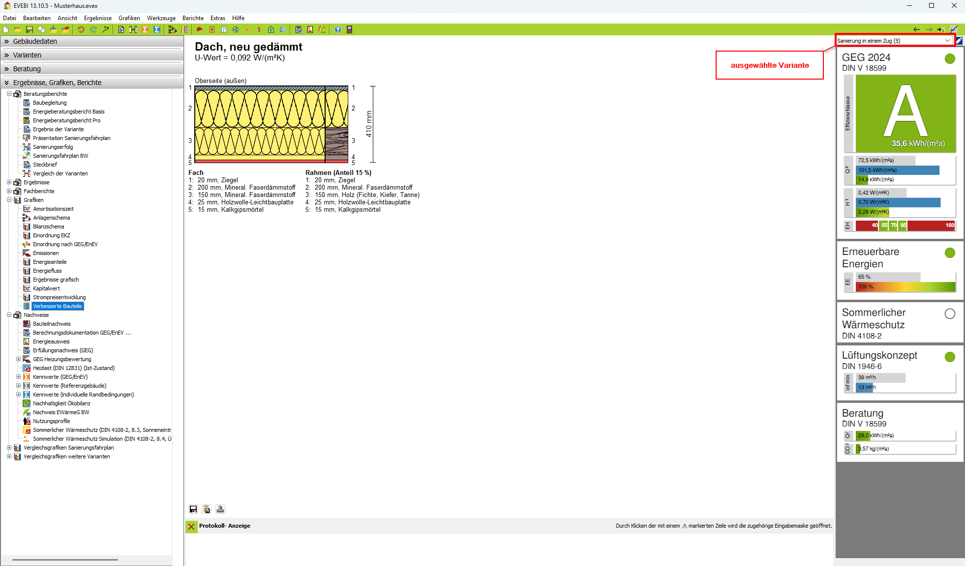 Hinweis: Der Schichtaufbau der verbesserten Bauteile wird standardmäßig in den Beratungsbericht im Abschnitt “Beschreibung der verschiedenen Energieeinsparmaßnahmen, Variante Dämmen” übernommen.
