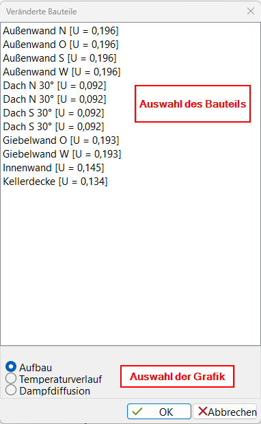 Haben Sie durch Maßnahmen Bauteile verbessert (Dämmung, veränderter Schichtaufbau oder Bauteilaustausch), so können Sie sich zu diesen Bauteilen den Aufbau, den Temperaturverlauf oder die Dampfdiffusionskurve als Grafik ausgeben lassen.
