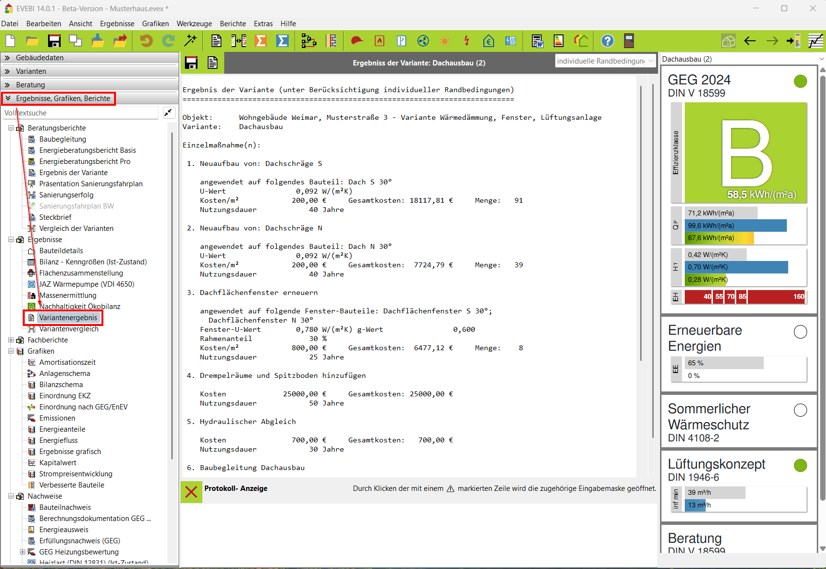 Diese Ausgabe wird auch in einem Bericht zur Verfügung gestellt. Diesen finden Sie unter Ergebnisse, Grafiken, Berichte > Beratungsberichte > Ergebnis der Variante.