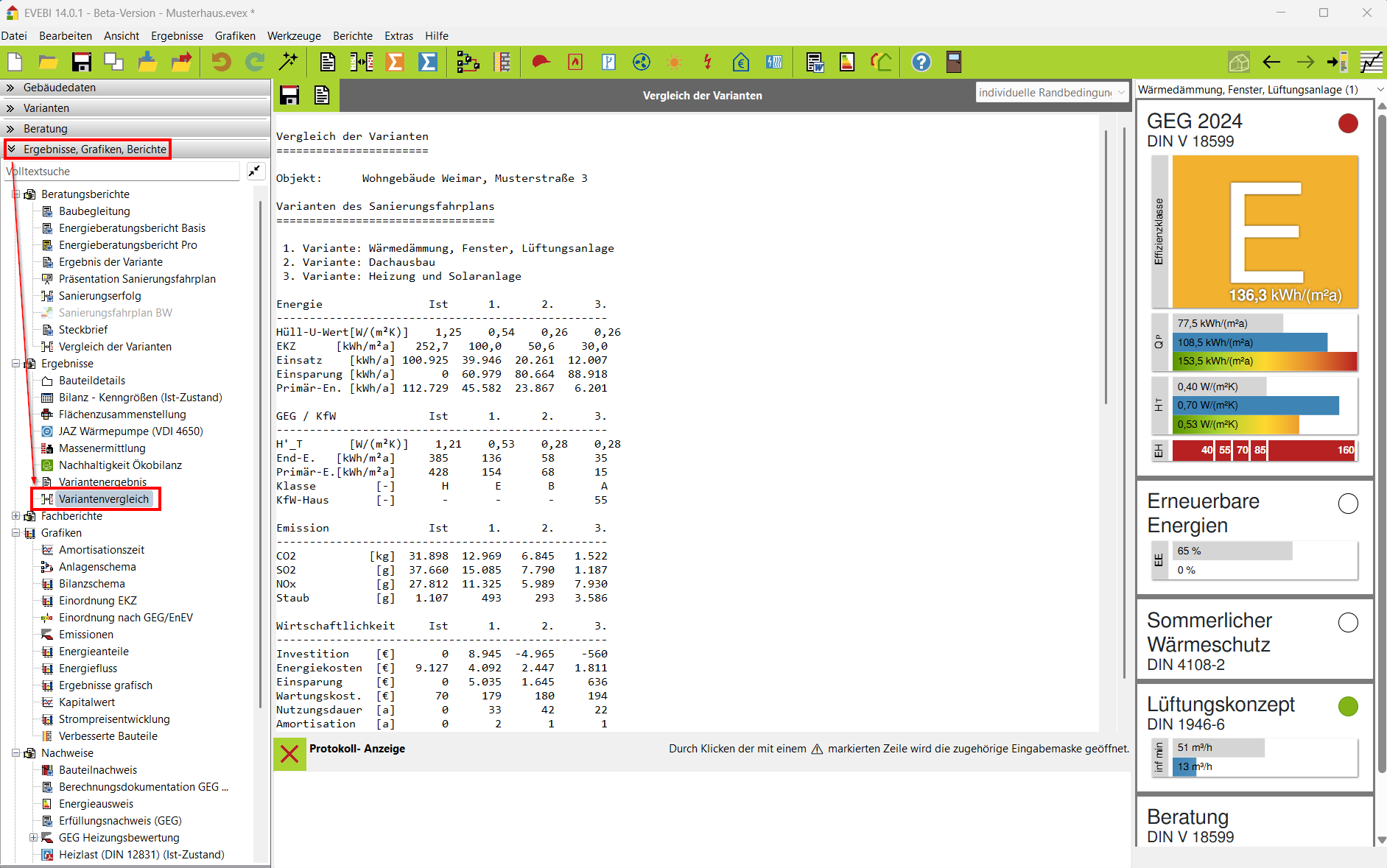 Diese Ausgabe wird auch in einem Bericht zur Verfügung gestellt. Diesen finden Sie unter Ergebnisse, Grafiken, Berichte > Beratungsberichte > Vergleich der Varianten.