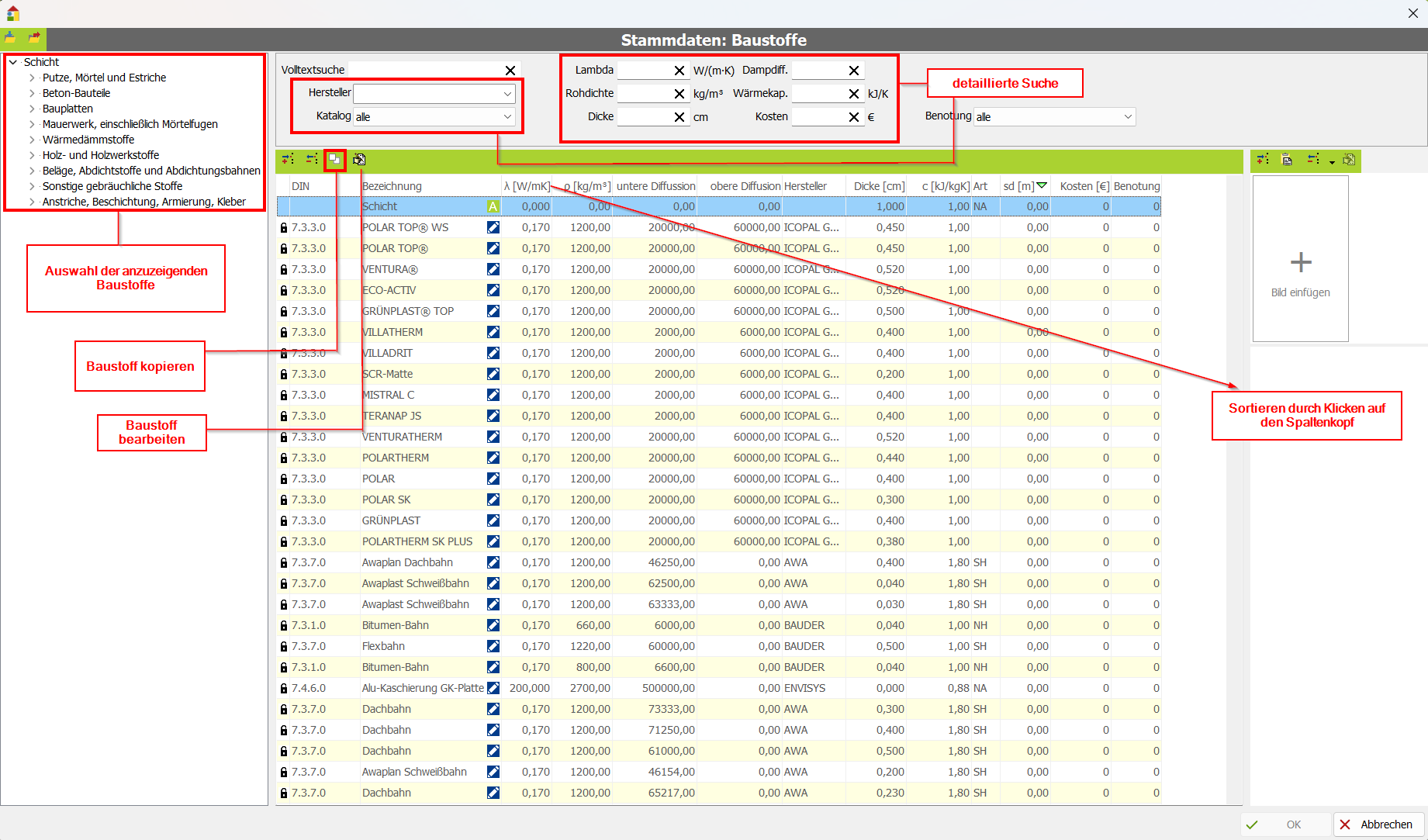 Die in der Baustoffdatenbank enthaltenen Baustoffe entsprechen ihren Kennwerten nach der DIN V 4108-4 und DIN EN 12524 sowie den Herstellerangaben.