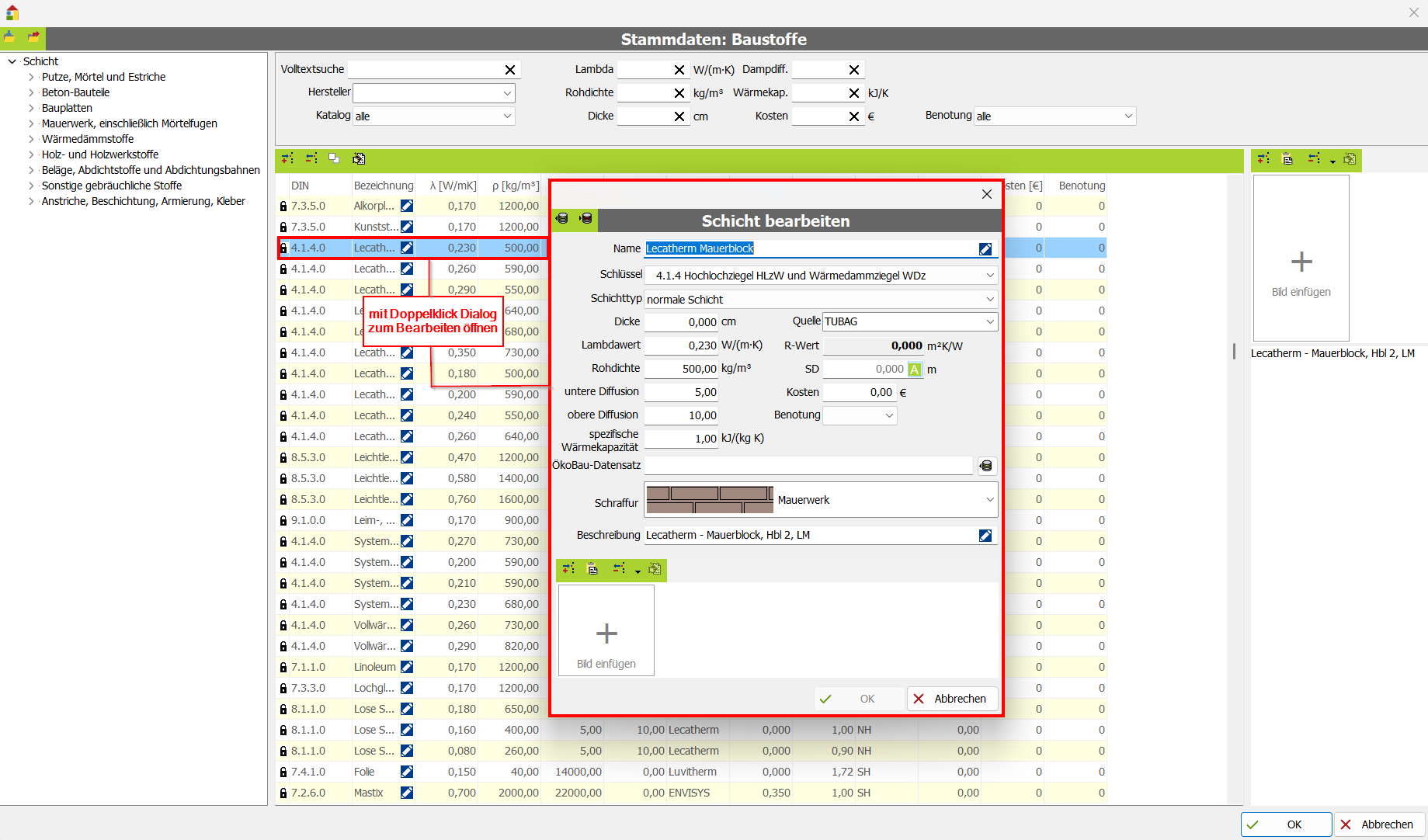 - Wählen Sie den gewünschten Baustoff in der Baustofftabelle.