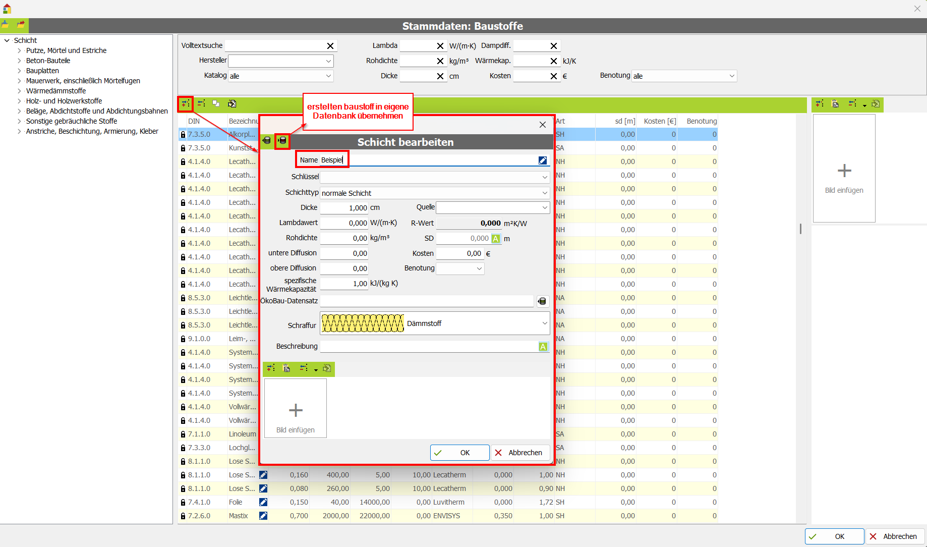 Sie können die Baustoffdatenbank um Baustoffe, Dämmstoffe und Folien erweitern.