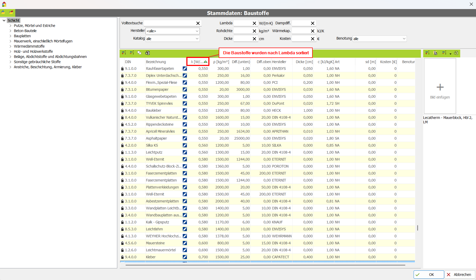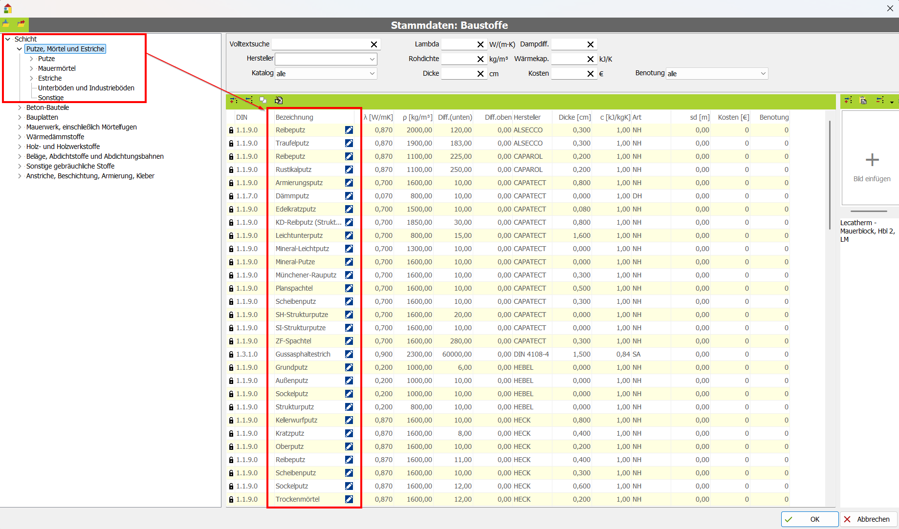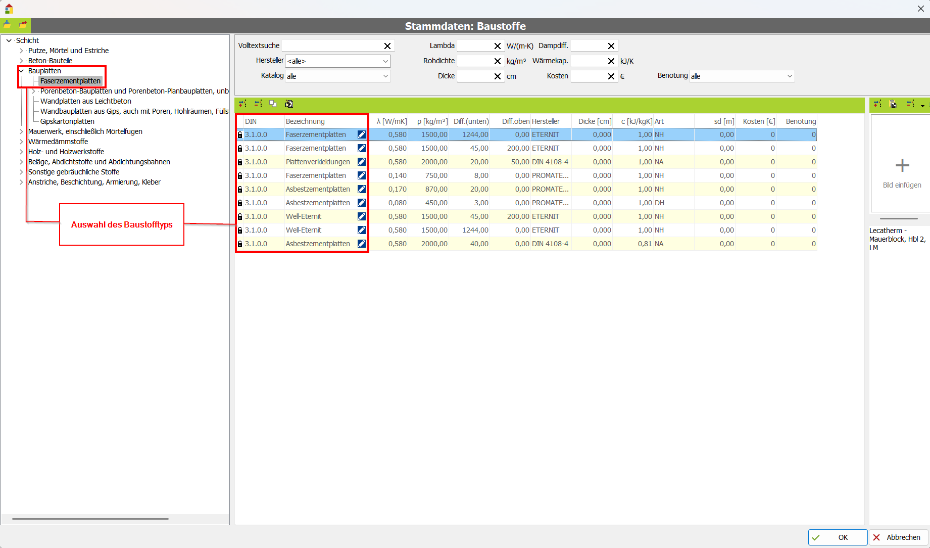 Die Baustoffdatenbank ist sehr umfangreich. Sie haben einige Möglichkeiten, schnell den gewünschten Baustoff zu finden: