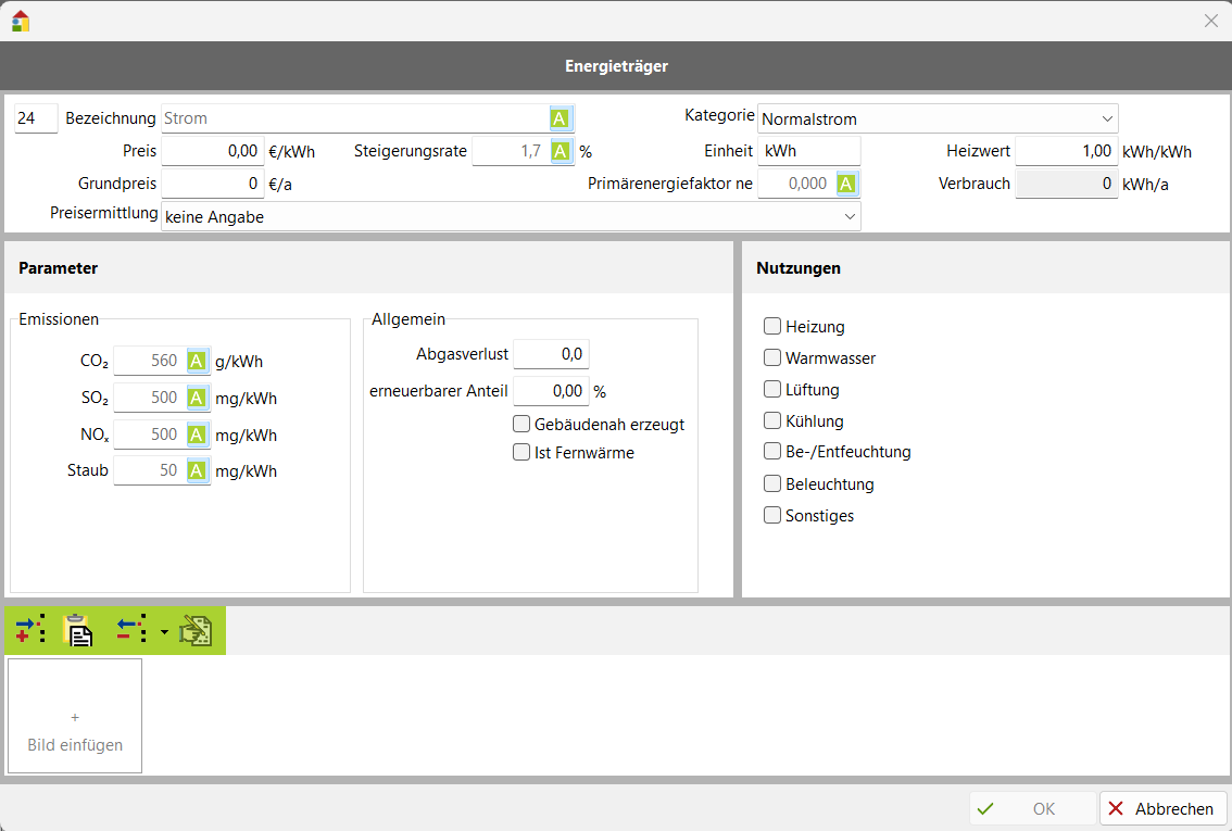 - Wählen Sie im Menü Extras > Datenbankpflege > Energieträger. Die Datenbank wird geöffnet.