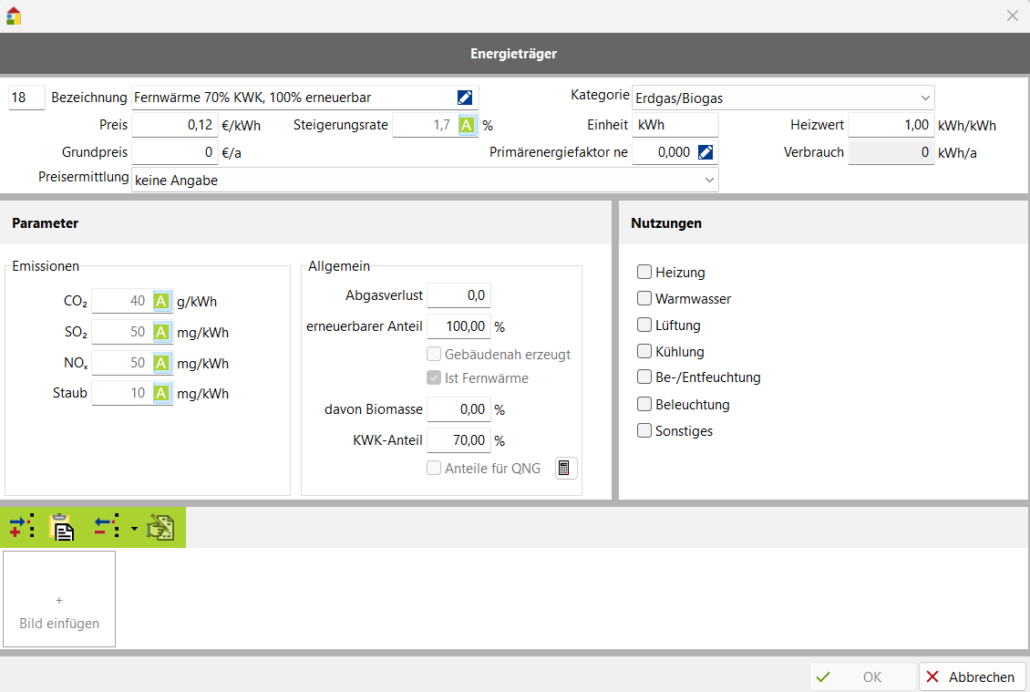 - Es können nur eigene Energieträger bearbeitet werden (ab ID 100). Damit wird sicher gestellt, dass bei einem Update eigene Energieträger nicht überschrieben werden.