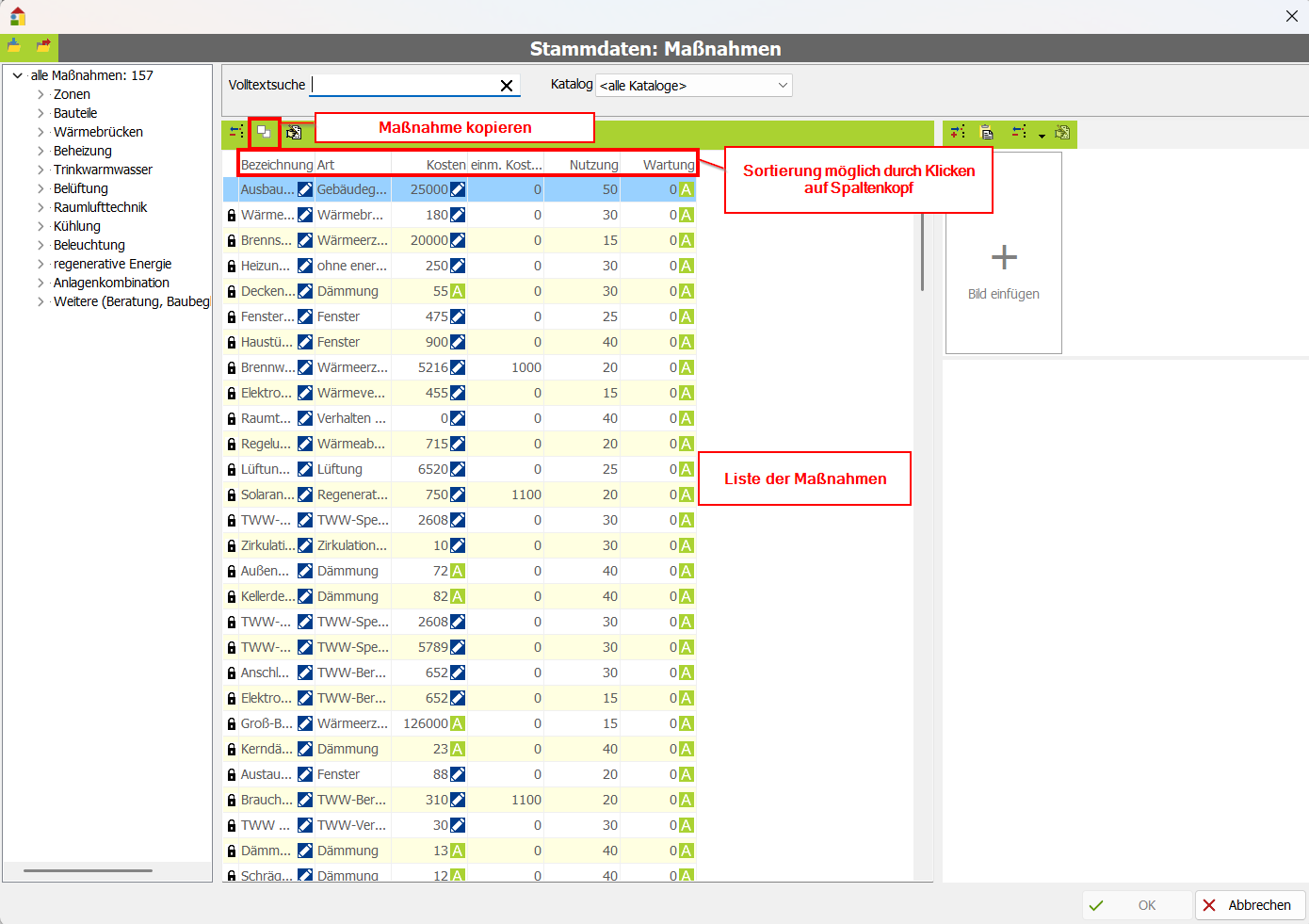 In der Maßnahmendatenbank werden die Energieeffizienzmaßnahmen gespeichert, welche individuell für ein Projekt verwendet werden können. Die Maßnahmen werden dazu in verschiedene Arten eingeteilt, wie Dämmung, Fenster, Wärmeerzeuger etc.