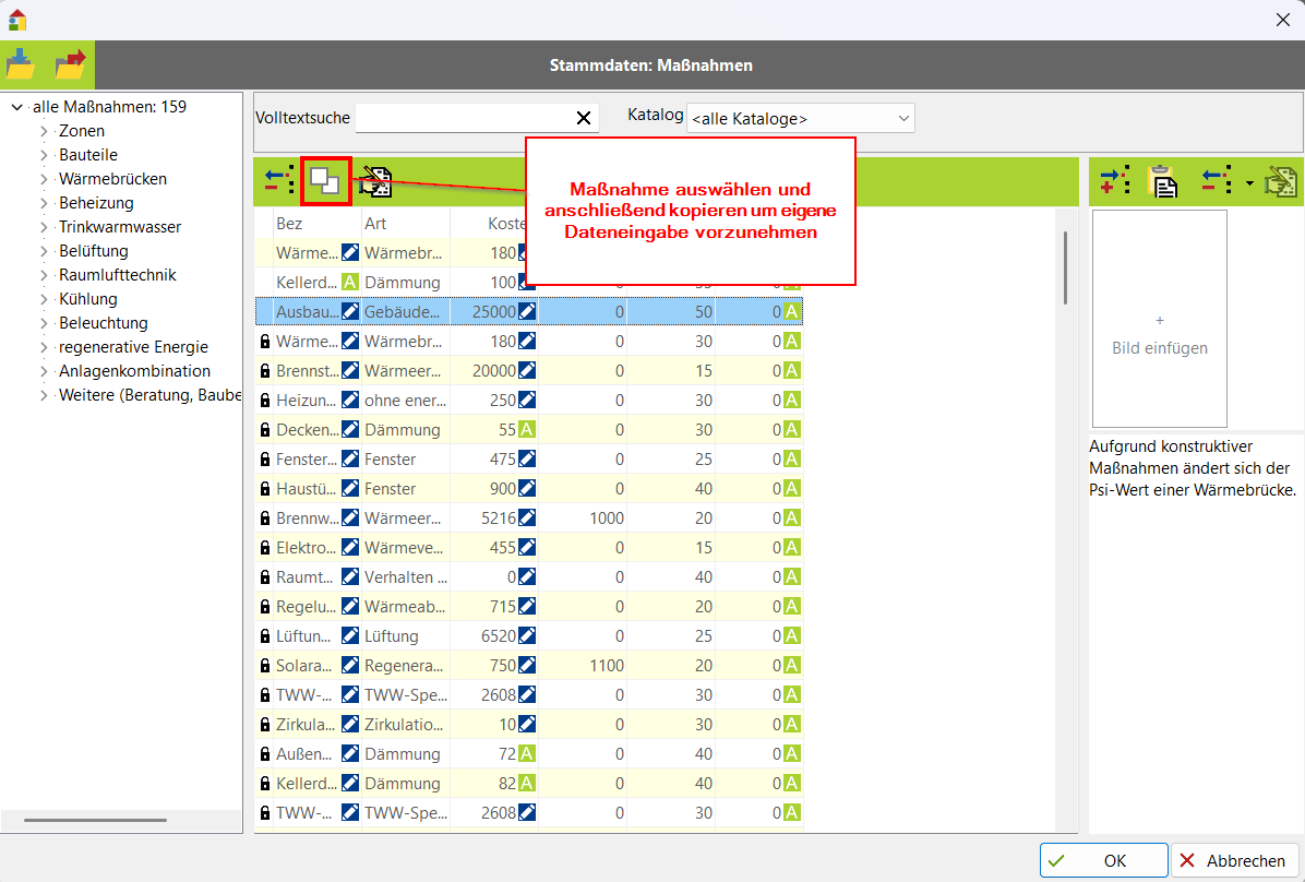 - neue Maßnahme erfassen im Maßnahmenkatalog, entsprechend anpassen und dann Übernahme in die Datenbank.
