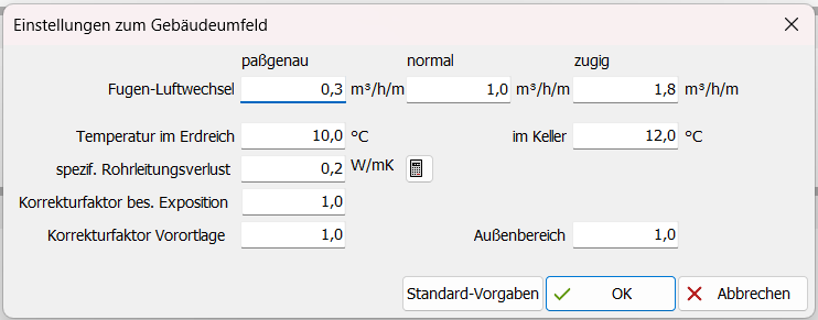 Zum Gebäudeumfeld können Sie Daten, wie Luftwechselrate durch Fugen, Erdreichtemperatur etc. angeben. EVEBI berücksichtigt diese Angaben bei der Berechnung (LEG). Damit können Sie die spezifischen Umstände beim Gebäude sehr genau berücksichtigen. Bei der GEG-Berechnung werden diese Angaben nicht übernommen! Die dort verwendeten Korrekturfaktoren sind nicht veränderbar (normiert) und werden vom Programm automatisch berücksichtigt.