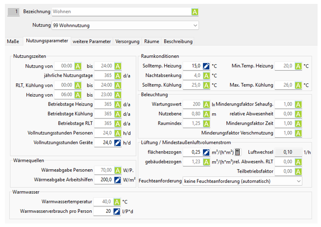 In Sonderfällen können auch andere Stellschrauben den Abgleich fördern. Die Randbedingungen der oben gezeigten Maske stammen fast alle aus der Seite Nutzungsparameter der Zone. Hier gibt es noch weiter Felder, mit denen Sie experimentieren können.