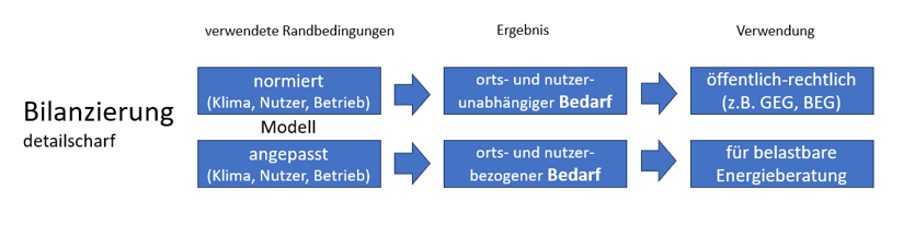 Wenn im Zusammenhang mit Energie-Bilanzierung vom Bedarf gesprochen wird, ist das ein berechnetes Ergebnis, das auf den Dateneingaben, aber auch auf vielen Randbedingungen und weiteren Annahmen beruht. Je nach Anwendungsfall ist das sehr häufig der normierte Bedarf – mit den Randbedingungen für den öffentlich-rechtlichen Nachweis weg (z.B. GEG und BEG), aber auch der angepasste Bedarf, bei dem die lokalen und individuellen Nutzer- und Nutzungs-Bedingungen für das Modell herangezogen werden.