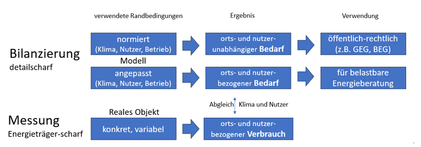 Ein gerechnetes Ergebnis wird in den seltensten Fällen genau mit dem gemessenen Verbrauch übereinstimmen. Das liegt an der Güte und Passgenauigkeit des Modells. Man kann sehr gut erkennen, dass es abwegig ist, diese Übereinstimmung zu erwarten, wenn der Zweck der Bilanz ein öffentlich-rechtlicher Nachweis über das Gebäude ist – das Modell ist ja normiert. Die normierte Bilanz dient einem objektiven, reproduzierbaren Urteil über die energetische Qualität eines Gebäudes und seiner Komponenten (nicht den Nutzer) . Sie wird daher in allen Bewertungen eingesetzt, wie sie typischer Weise im Gebäudeenergiegesetz für Energieausweise und Erfüllungsnachweise sowie in der Förderung gefordert werden. Man versucht bei der normierten Bilanz, ein einheitliches Klima (Potsdam) festzulegen und eine Normnutzung nachzubilden.
