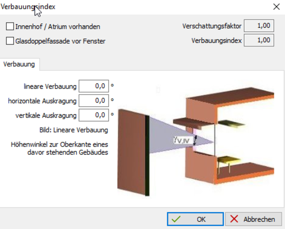 - Lineare Verbauung: Die lineare Verbauung berücksichtigt vor der Fassadenöffnung befindliche Bauten etc.