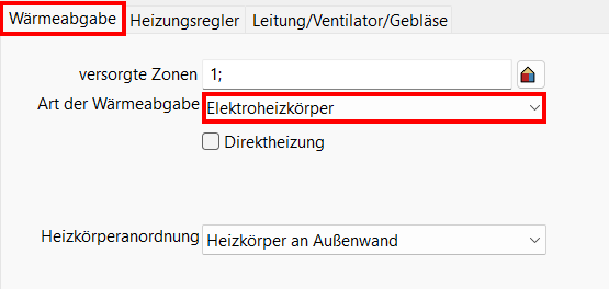Wählen Sie unter Art der Wärmeabgabe: Elektroheizung