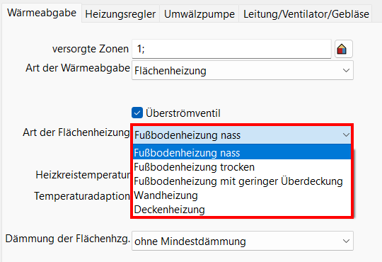 • Art der Flächenheizung: Auswahl zwischen folgenden Angaben: