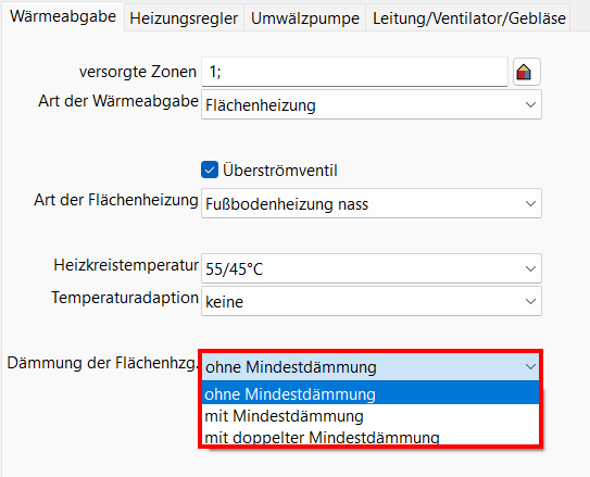 • Dämmung der Flächenheizung.: Auswahl zwischen den folgenden Angaben: