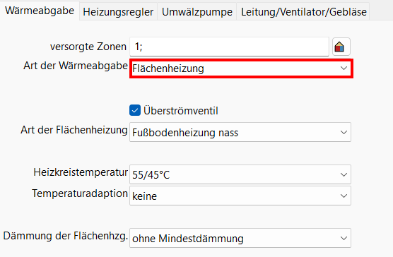 Wählen Sie unter Art der Wärmeabgabe: Flächenheizung.