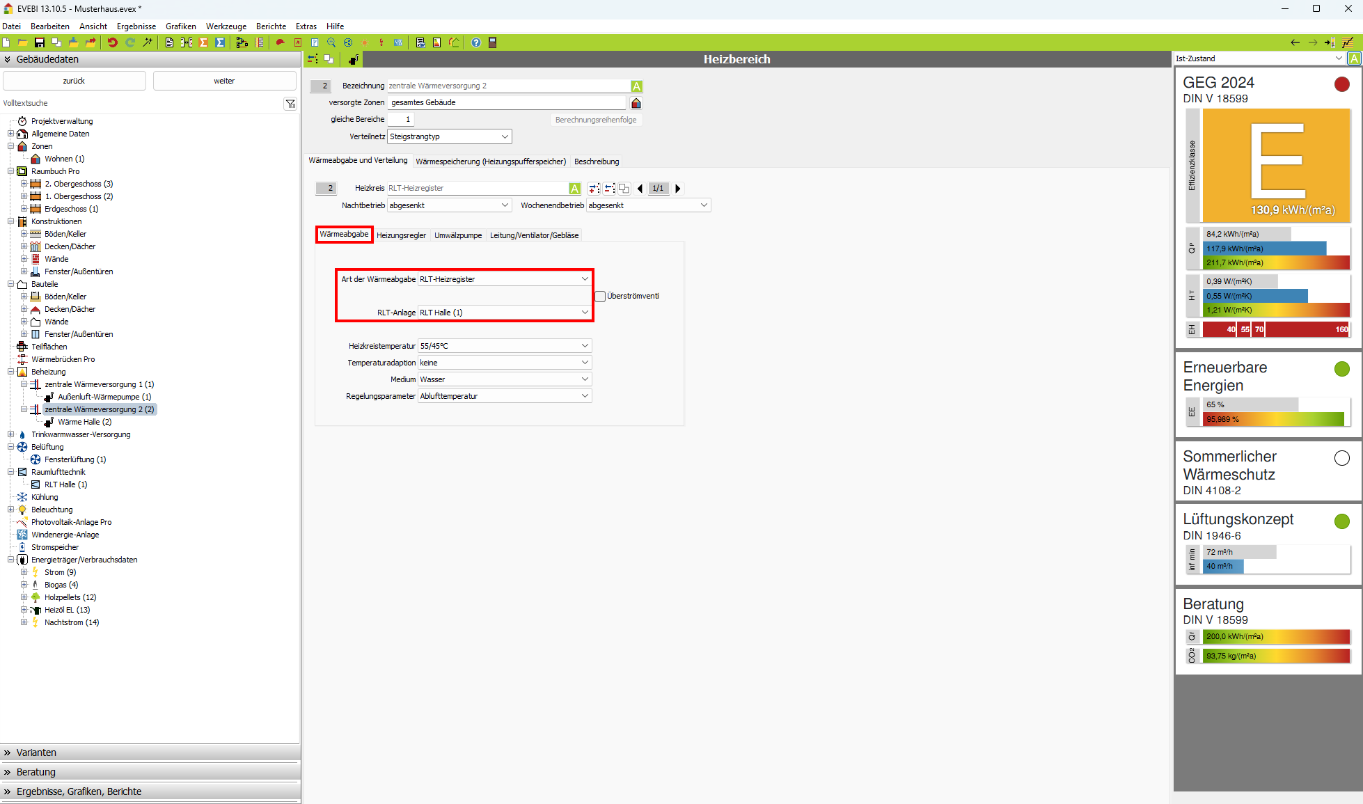 - Hierbei handelt es sich um eine Nachheizung bzw. Umluftheizung über eine RLT-Anlage. Diese RLT-Anlage ist zusätzlich in EVEBI zu definieren (siehe unter: RLT-Anlagen erfassen und bearbeiten (DIN V 18599)). Eine bereits definierte RLT-Anlage ist die Voraussetzung für die hiesige Auswahl RLT.