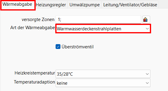 Wählen Sie unter Art der Wärmeabgabe: Warmwasserdeckenstrahlplatten