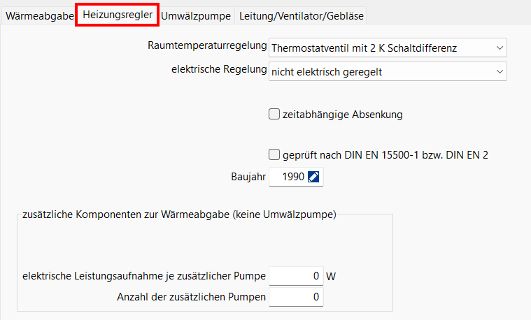 In diesem Dialog machen Sie Angaben zur Regelung der Heizkörper, Heizflächen etc. und von ggf. weiteren vorhandenen Pumpen oder Ventilatoren, die der Regelung der Wärmeabgabe dienen.
