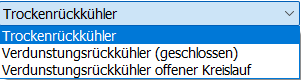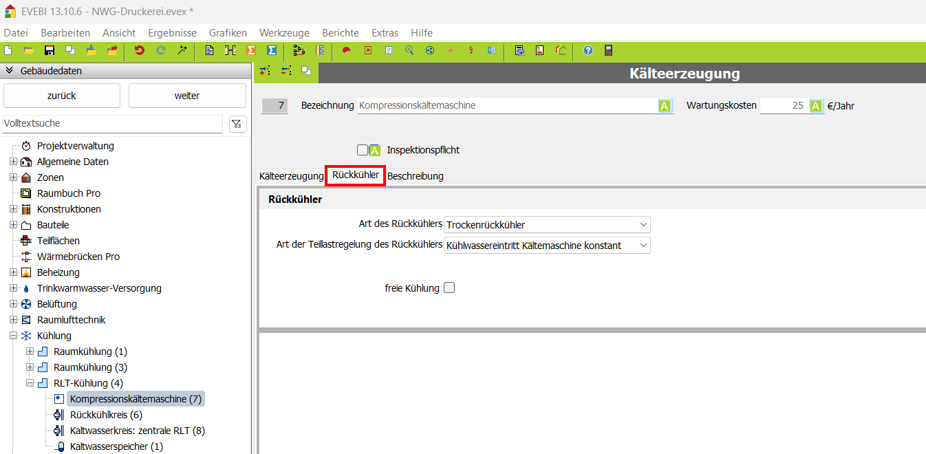 Die Daten zum Rückkühler stehen nur für den vorherig ausgewählten Maschinentyp Kompressionskältemaschine, Absorptionskältemaschine, gasbefeuerte Absorptionskältemaschine zur Verfügung.