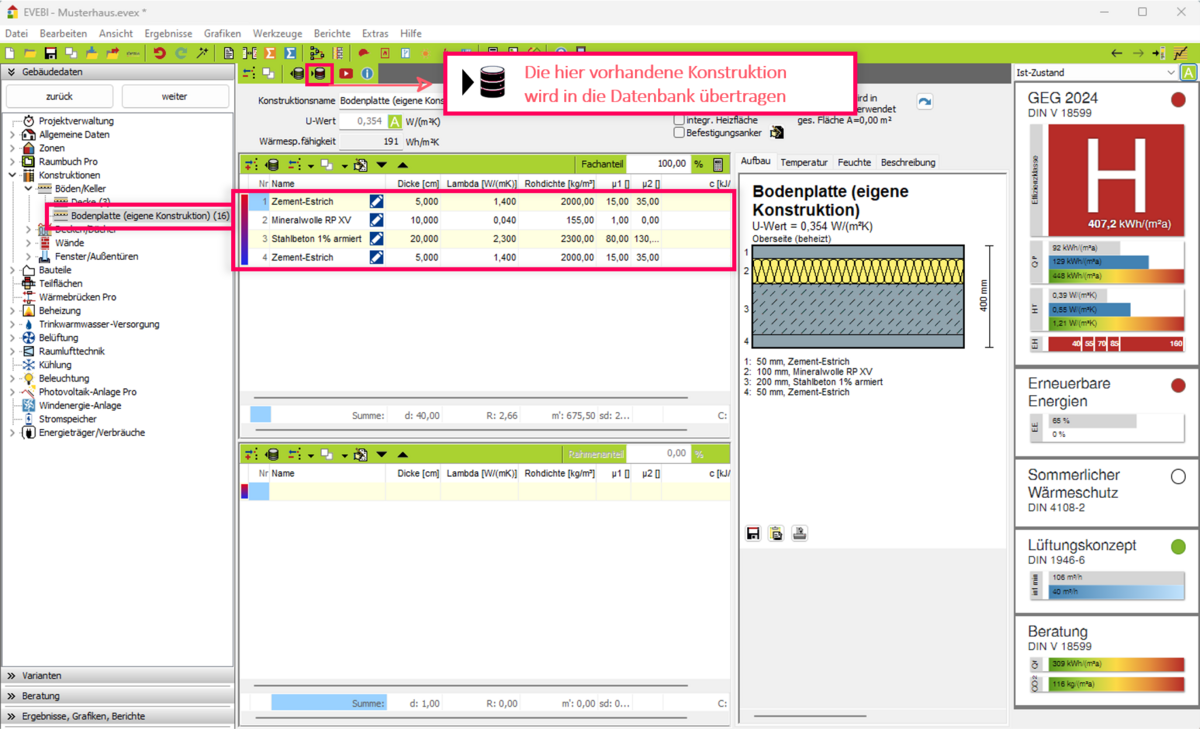 Haben Sie eine Konstruktion angelegt, die für Ihre Region typisch ist bzw. welche Sie auch für andere Projekte verwenden möchten, so können Sie diese in die Konstruktionsdatenbank übertragen.