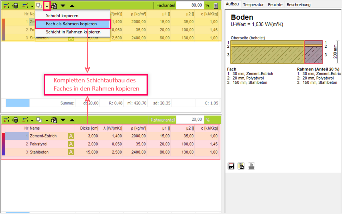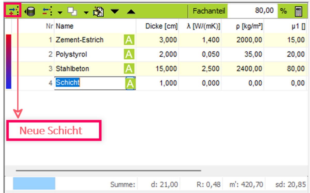 - Tragen Sie den Fachanteil zum Schichtaufbau direkt ein. Es wird eine weitere Tabelle für die Eingabe eines weiteren Schichtaufbaus angelegt.