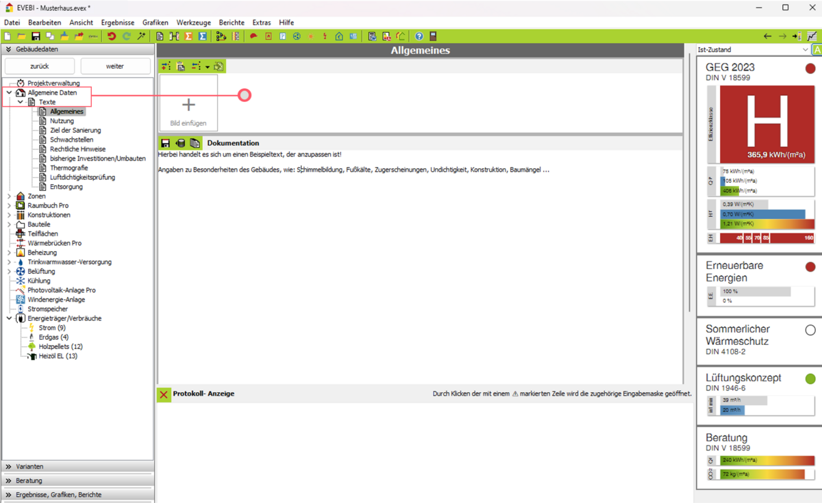 Jedes Objekt hat seine Eigenheiten, seine Geschichte und seine Probleme. Nicht alles kann in Zahlen und Rubriken abgehandelt werden. Daher wurde in EVEBI die Möglichkeit geschaffen, individuelle Texte einzugeben und diese in die Berichte einzubauen.