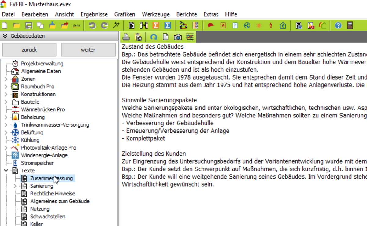 EVEBI ermöglicht Ihnen, Bemerkungen, Hinweise, Informationen etc. zum Projekt einzugeben, welche in den Vor-Ort-Bericht übernommen werden sollen. Hierzu können Sie zu jedem Bauteil, jedem Heizbereich, jedem Wärmeerzeuger etc. Text eingeben und auch Grafiken und externe Texte einzubinden.