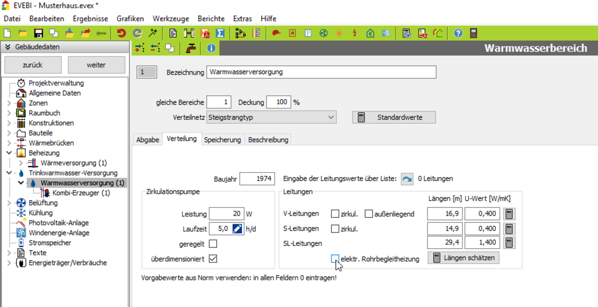 Daten der Warmwasser-Verteilung (DIN V 4701-10/12, LEG)