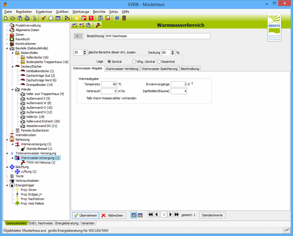 Die Daten der Trinkwarmwasser-Abgabe müssen zu jedem Trinkwarmwasser-Bereich erfasst werden.