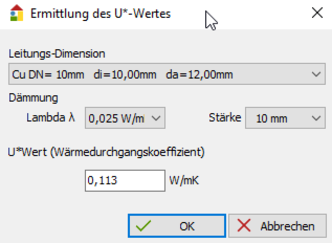 Bestimmende Faktoren für den U*-Wert sind der Leitungsquerschnitt, die Wärmeleitfähigkeit und Stärke der umgebenden Dämmschicht. Die Leitungsdimension wird aus einer Liste, die den Querschnitt in mm und Zoll sowie den Innen- und Außendurchmesser gängiger Leitungen enthält, ausgewählt.