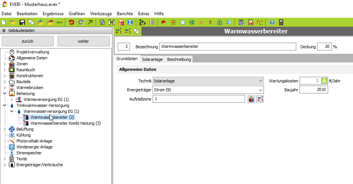 Eine Solaranlage wird i.d.R. als Zweitanlage erfasst, da sie immer einen Teil der Gesamtdeckung übernehmen wird. Die Deckung können Sie automatisch ermitteln lassen (s. u.).