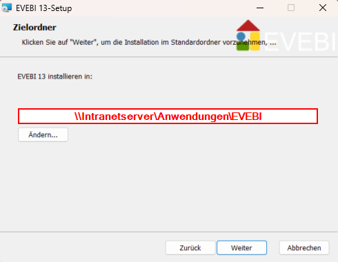 Als Zielverzeichnis wählen Sie einen Ort aus, der für jeden EVEBI-Anwender in Ihrem Unternehmen mit Schreibzugriff erreichbar ist.