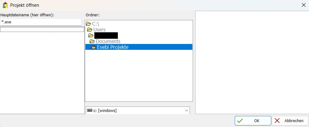 Sollte im rechten Teil des Fensters der Pfad zum Projektordner nicht automatisch angezeigt werden, ist dieser bei einer Standardinstallation unter C:\Users\Benutzername\Documents\EVEBI\proj zu finden und ggf. einzustellen. Im linken Teil des Fensters muss die gewünschte Projekt.eve-Datei angewählt werden.
