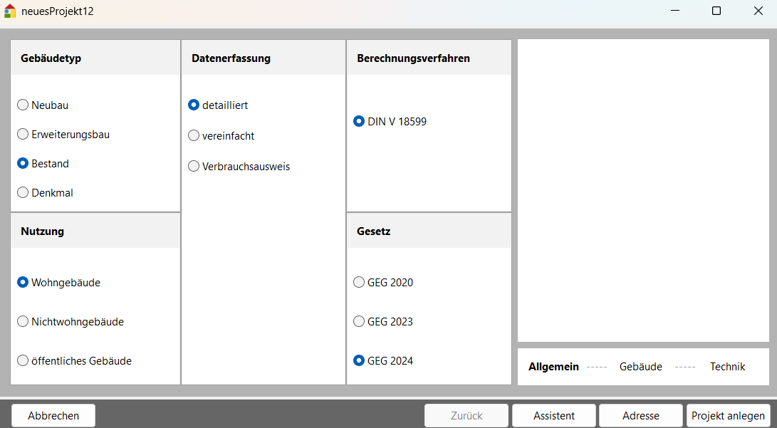 Berechnungsverfahren: Wählen Sie das Berechnungsverfahren, in dem Ihr Projekt bilanziert werden soll. Für Wohngebäude kann zwischen DIN 4108/ DIN 4701 und DIN V 18599 gewählt werden. Für die Energieberatung werden die individuelleren Randbedingungen (Nutzung, Klimaregion, etc.) mit dem Berechnungsverfahren nach LEG („Leitfaden energiebewusste Gebäudeplanung“, Institut für Wohnen und Umwelt) herangezogen. Für Nichtwohngebäude erfolgt die Berechnung hauptsächlich nach DIN V 18599.