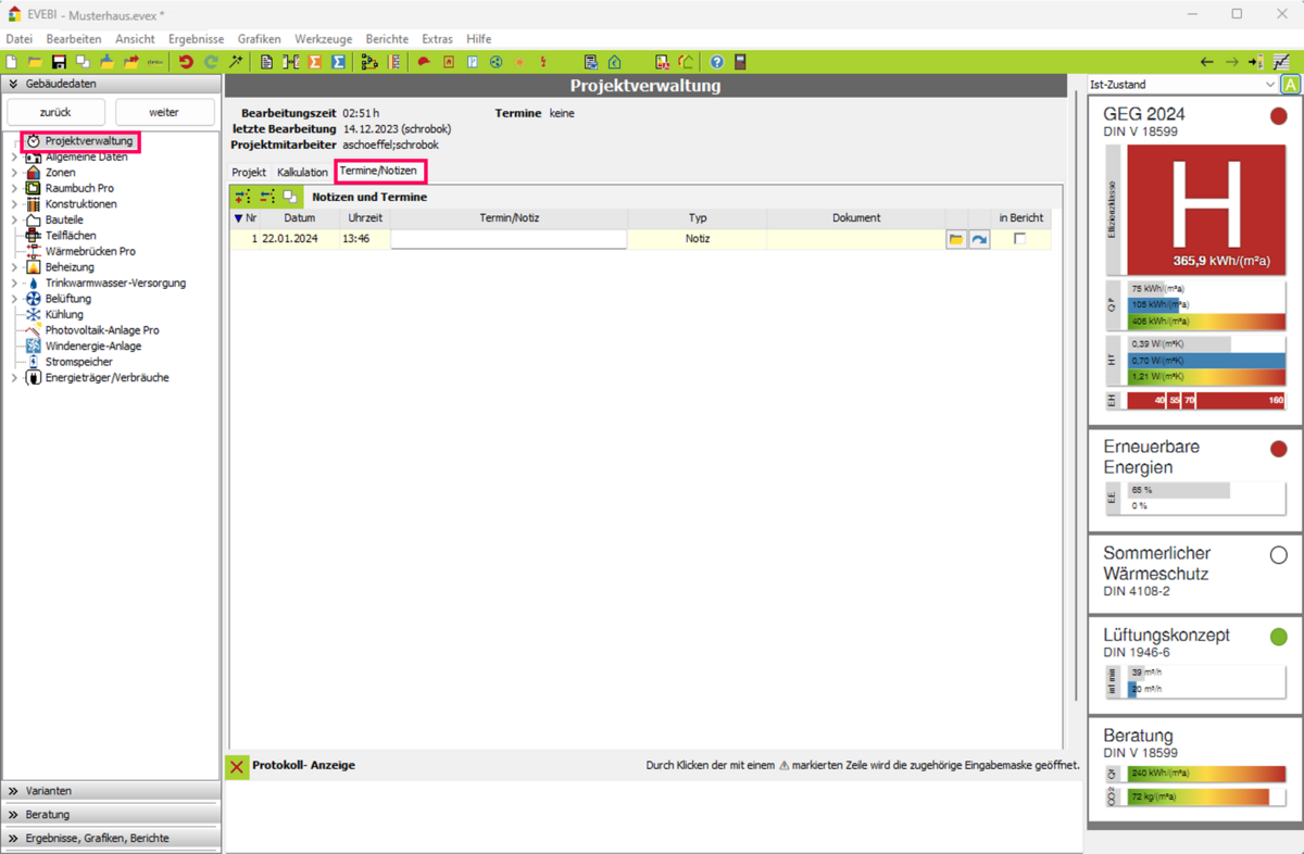 Sie haben die Möglichkeit, zum aktuellen Projekt mehrere Notizen mit einem Arbeitsstatus anzulegen, Termine zu überwachen und zu jeder Notiz / jedem Termin eine Datei zu verknüpfen. Damit haben Sie die Möglichkeit, verschiedene Termine, Absprachen, Protokolle etc. zu verwalten.
