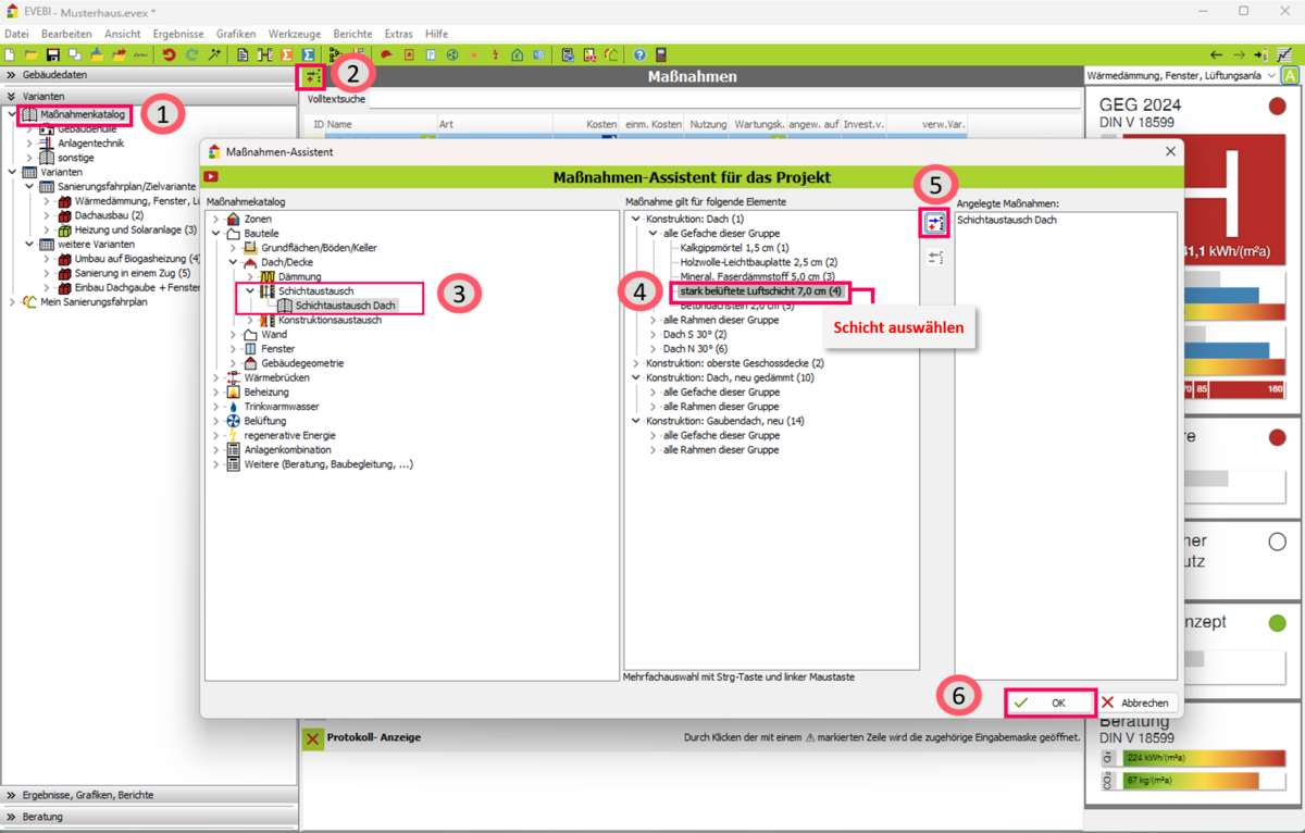 - Passen Sie die Eigenschaften der neu erstellten Maßnahme(n) an. siehe unter: Bearbeiten Bauteilschicht ersetzen.
