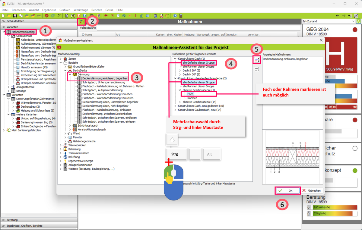 - Dämmmaßnahme: In Abhängigkeit der Bauteilart werden die Dämmmaßnahmen aus der Maßnahmendatenbank angezeigt.