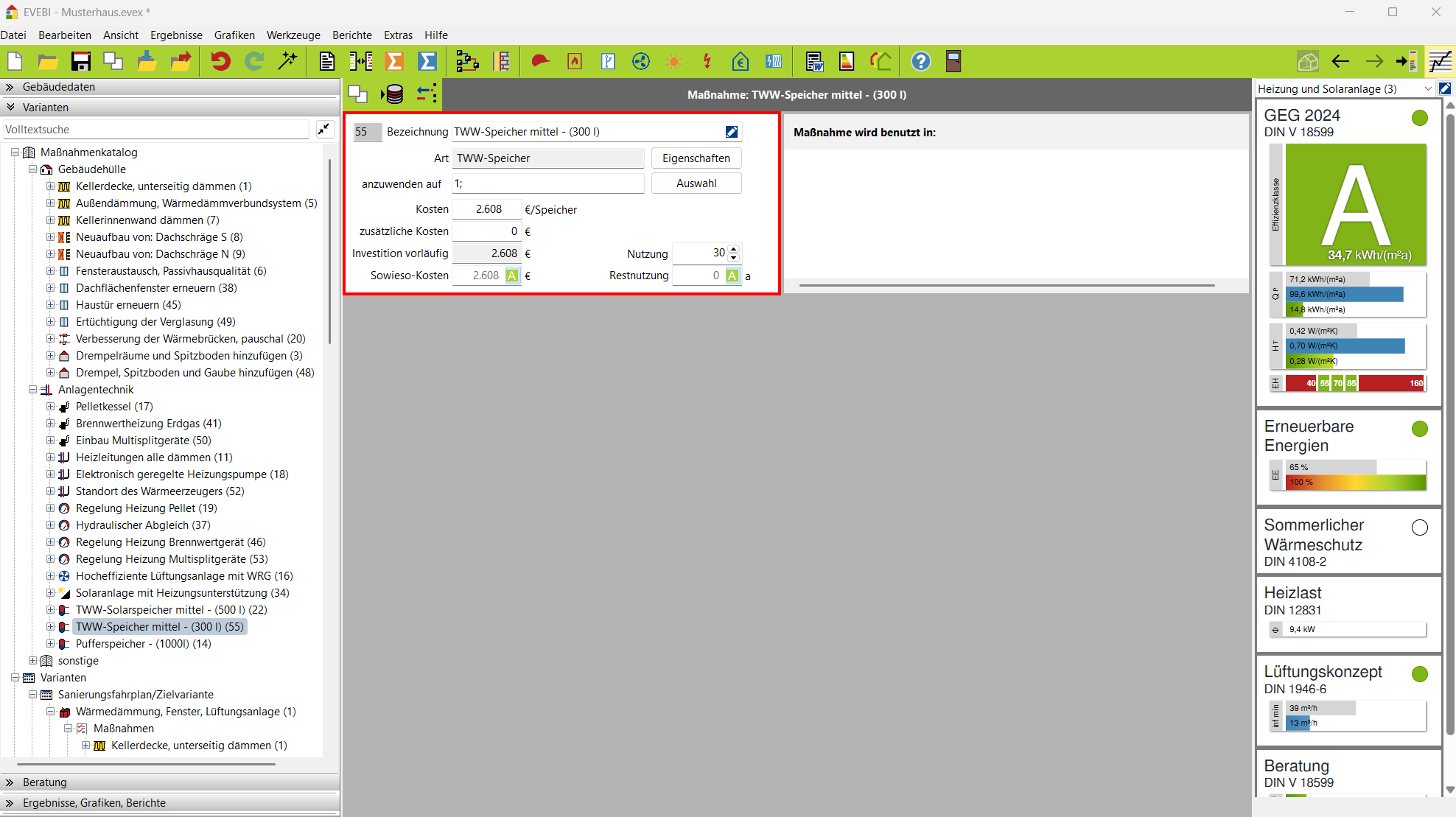 Nutzung: Geben Sie die Nutzungsdauer der Maßnahme an. Diese wird bei der Wirtschaftlichkeitsberechnung berücksichtigt. Haben Sie in einer Variante Maßnahmen mit verschiedenen Nutzungsdauern erfasst, so werden für die Berechnung der Wirtschaftlichkeit die Nutzungsdauern nach der Investitionssumme gewichtet.